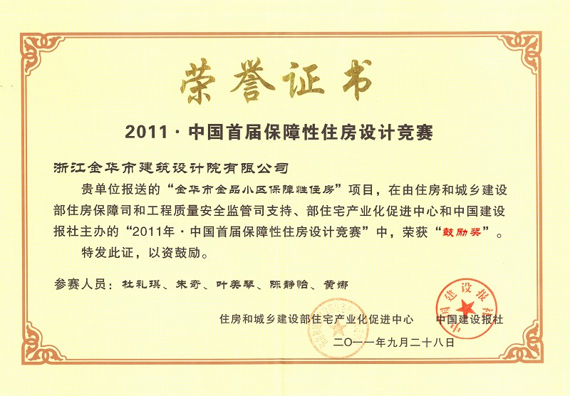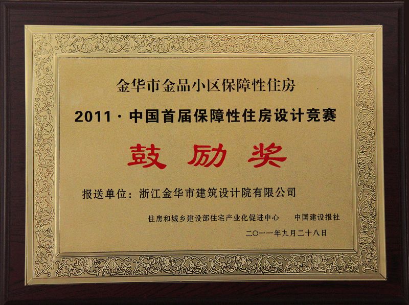 本院設(shè)計(jì)的“金品小區(qū)保障性住房”在住房和城鄉(xiāng)建設(shè)部舉辦的“2011年·中國(guó)首屆保障性住房設(shè)計(jì)競(jìng)賽”中獲獎(jiǎng),并于第十屆中國(guó)國(guó)際住宅博覽會(huì)上舉行頒獎(jiǎng)典禮。本次競(jìng)賽的主題定為“以人為本,安居樂(lè)業(yè)”。旨在更好的推廣優(yōu)秀的保障性住房規(guī)劃設(shè)計(jì)方法,促進(jìn)保障性安居工程設(shè)計(jì)和建設(shè)的標(biāo)準(zhǔn)化和模數(shù)化。